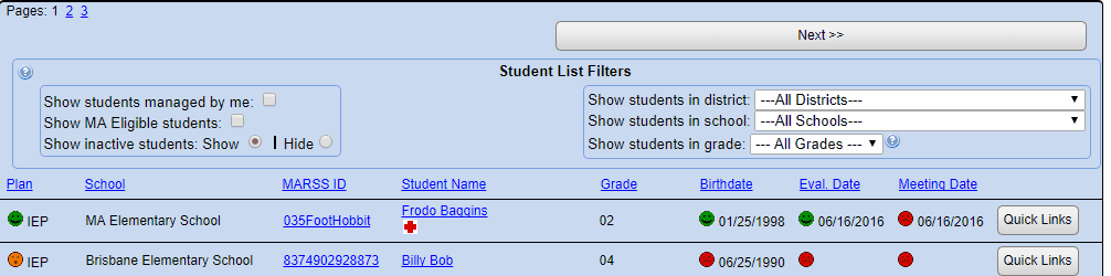 At the top of the student list are a series of check boxes and drop downs. These are the active filters introduced in the July, 2016 update. In order to help facilitate navigation of a paged student list, these filters were added to help those with multiple districts, schools, or grade levels sort through and narrow down the list of students.