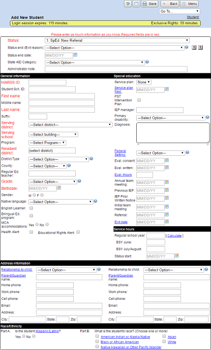 Items in Red like Status, Student / MARSS ID, First Name, Last Name and Serving District are required.