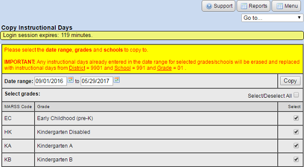 • If a grade is not set up for the target school, it will be created by the copy function. You will need to go to the school's setup and define the length of the school day.