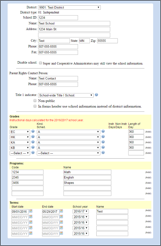 • The Terms section allows you to add a start date, end date, school year and term name. These can be quarters, trimesters or semesters or whatever terms you need.