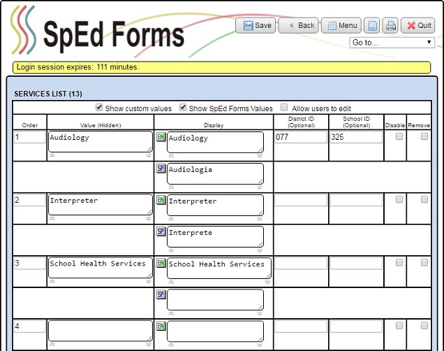 You will need to create a Services List for certain parts of SpEd Forms to function correctly. The services list will be used in service plans and to help in reporting.