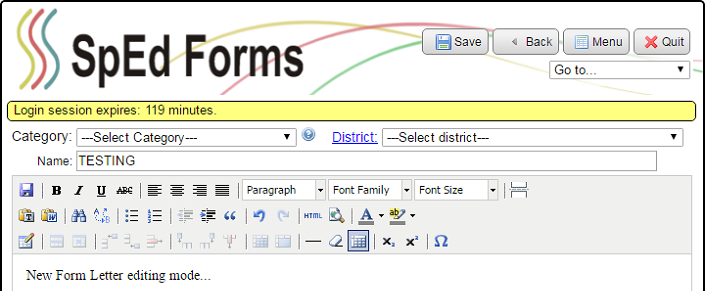 2. Edit the body of the form letter. Editing works like working in an ER section in Design Mode.