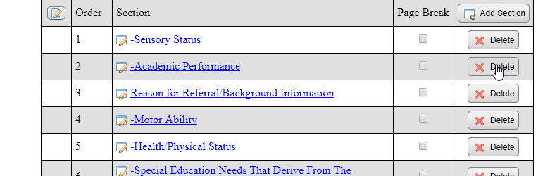 1. On the Evaluation Report menu, click the “Delete” button on the section you wish to remove.