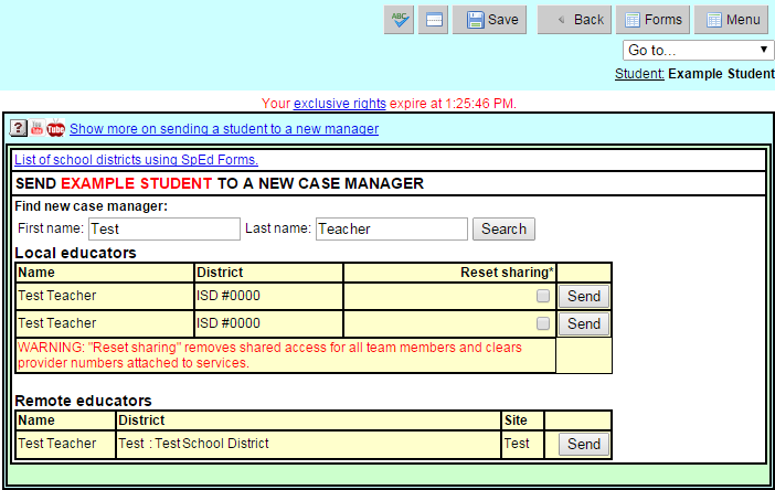 1. Navigate to the student's “Forms Menu”, click on “Student Sharing” and then the “Send this student to a new case manager” button.