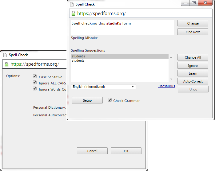 If the Spell Check only allows you to “Ignore Once” and/or the errors are shown in highlighted text, the Spell Check is checking for grammar. You can uncheck the “Check grammar” checkbox.