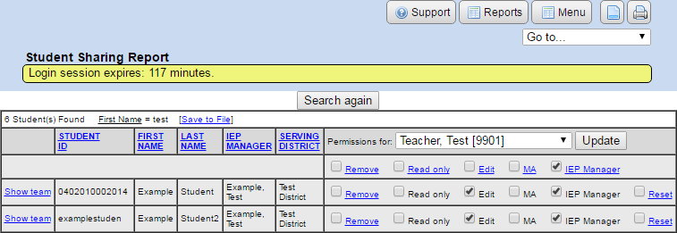 • You can select ALL the students in the list by clicking the header check box. For example, you can send all the students in the list to one IEP manager by clicking the “IEP Manager” check box in the very first (no student name) row. This works for all the check boxes in the very first row.