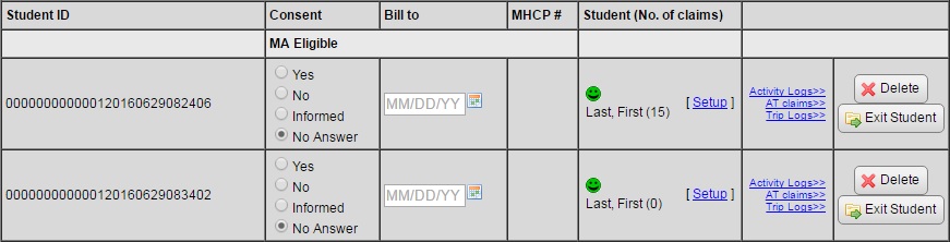 When exiting MA student records, all claim lines (activity, trip and AT logs) must be sent. The student cannot be exited if outstanding claims are found for that student. The number of claims is shown in parenthesis after the student's name.
