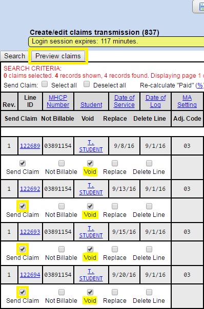 You should use the Replace feature if the date or service needs to be corrected for one or more students. Reasons to use the Void feature may include claims that have to be returned because the service was not billable, the wrong student was billed, or the wrong district was billed. You also must have the “CLM #” from your Remittance Advice or have imported the 835 X12 to utilize either option.