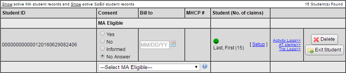 5. Click on “Activity Logs”, “AT Claims” or “Trip Logs” to create, view, edit or print the student's claim information.