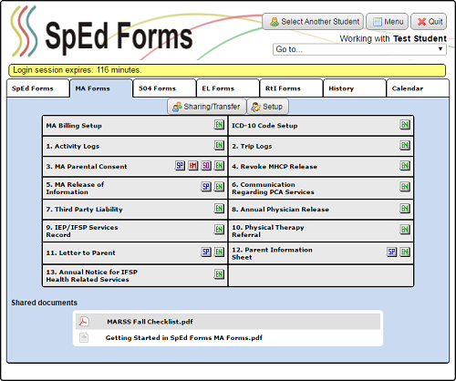 As soon as MA Forms is installed on your SpEd Forms server and you have been given access to that student, it can be accessed by clicking on the “MA Forms” tab toward the top of the “Forms Menu”.