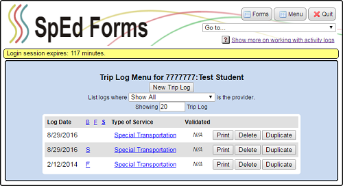 • On the log itself you can duplicate any number of trip lines by typing in a number in the “Duplicate for (number of days)” box and clicking on the “Duplicate” button (if the box is left blank only one log will be duplicated).