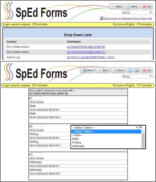 Most of the drop down lists in SpEd Forms are managed by the super administrator. The super administrator can also choose to allow users to add items to any of these lists. When you are allowed to add to a specific drop down list, a link will be provided on the “Drop Down Lists” page. When you add entries to a specific list, the additional entries will only be available to you. No other user will be able to see your personal entries or manage them.
