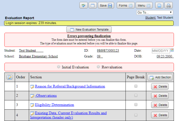 2. On the Form Menu, click “REFERRAL AND EVALUATION” if this section is not already open.