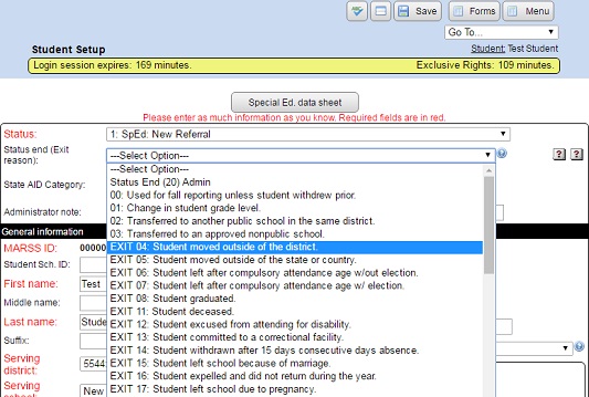 • Clicking “Activate” will clear the “Status end (Exit reason)” and set the “Status” to “4: Receiving special education services”. If you need to change the status to something other than “4”, go to the “Student Setup” and proceed with the instructions below.