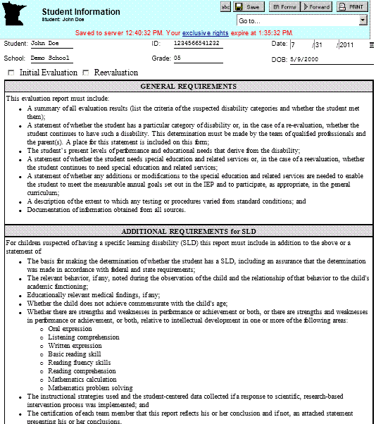The student information page is the first page of state recommended evaluation report. Demographic information is automatically included if it has been entered in “Student Setup”.