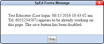 If another user is working on the same student and they navigate to the same form that you are working on, they will get a popup that states: