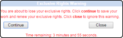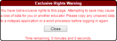 Information in the navigation bar keeps you informed of the status of your “exclusive rights”. Five minutes before the time that your “exclusive rights” will end, a warning will appear to inform you that your “exclusive rights” are about to expire. If you do not “Save” the page to retain your rights, the session bar will change (at the time of expiration) to inform you that your rights have expired.